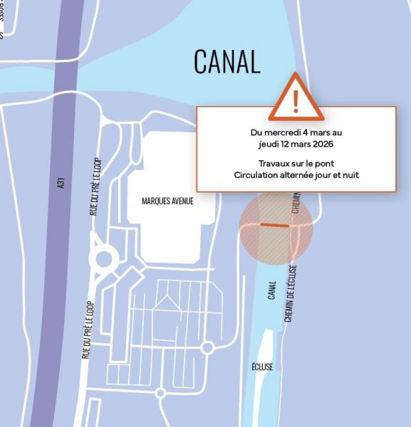 En raison de travaux, une circulation alternée avec feux sera mise en place du mercredi 4 mars à 8h au jeudi 12 mars 2026 au niveau du pont au dessus du canal, derrière Marques Avenue.